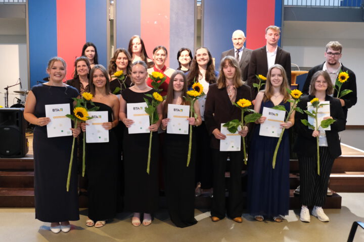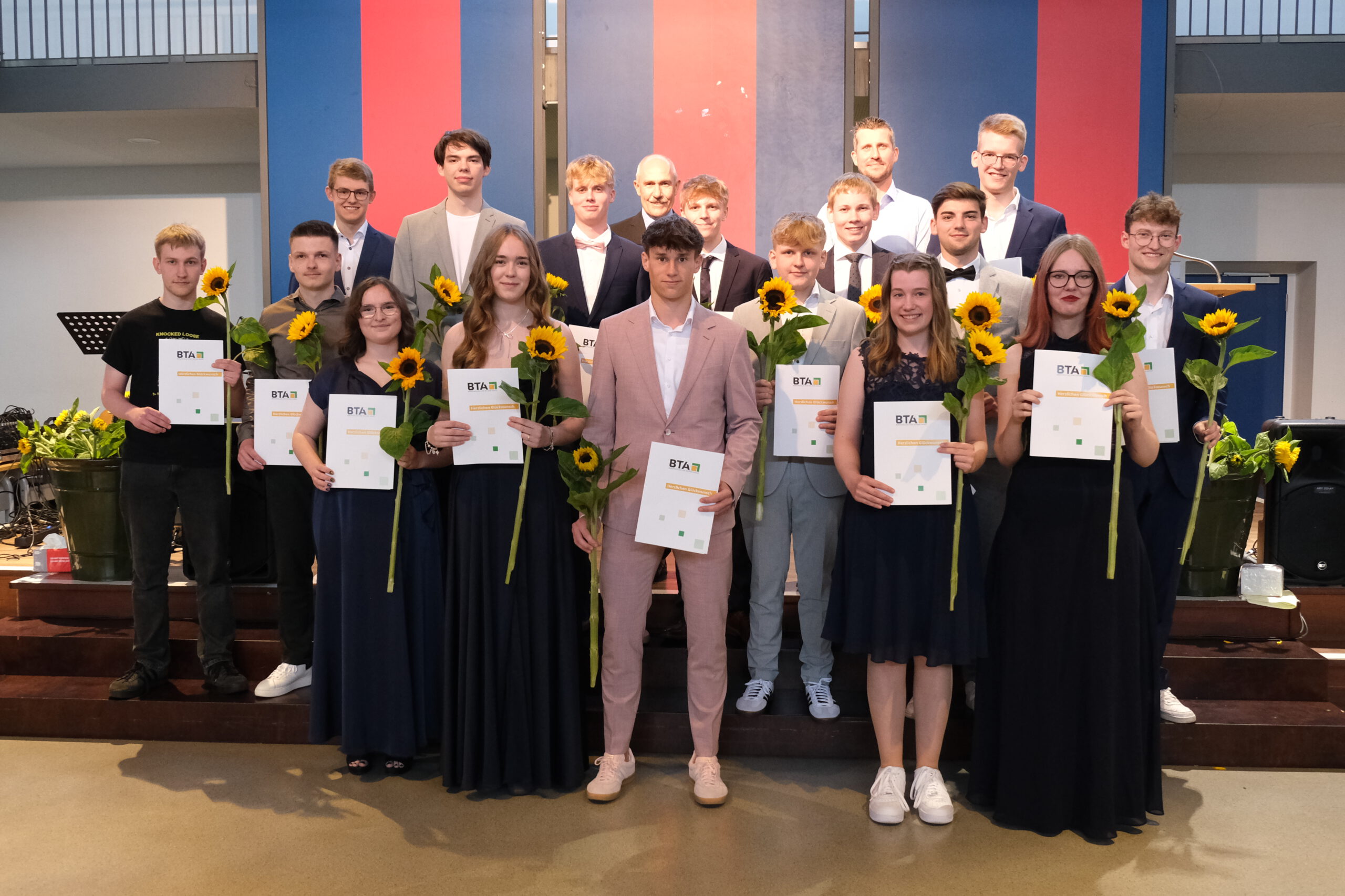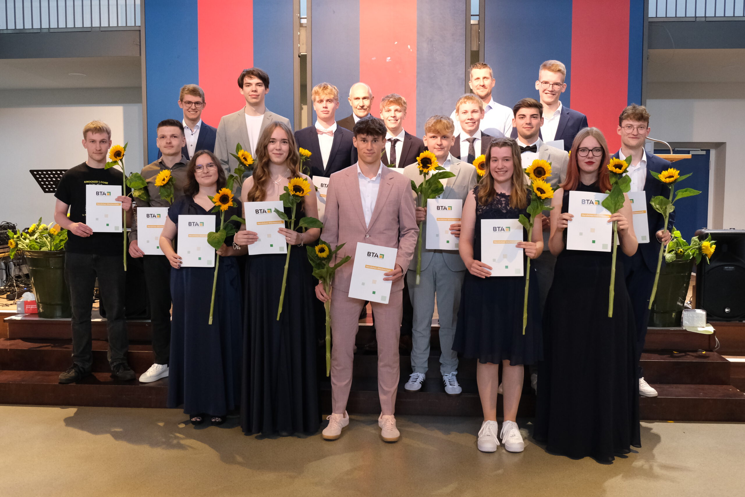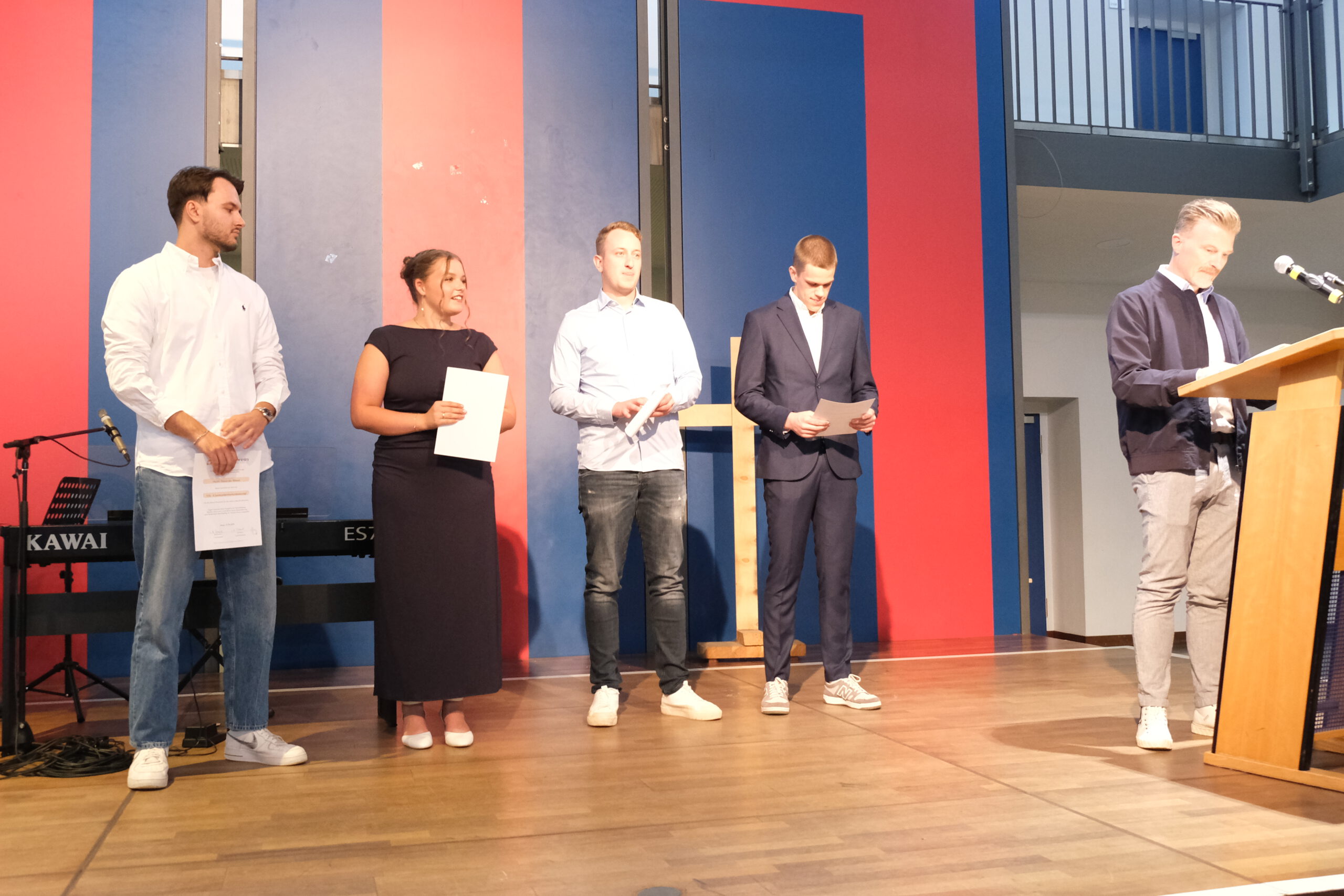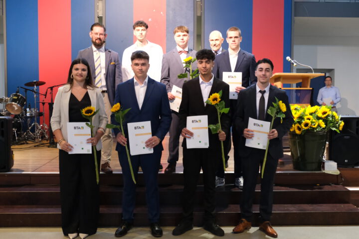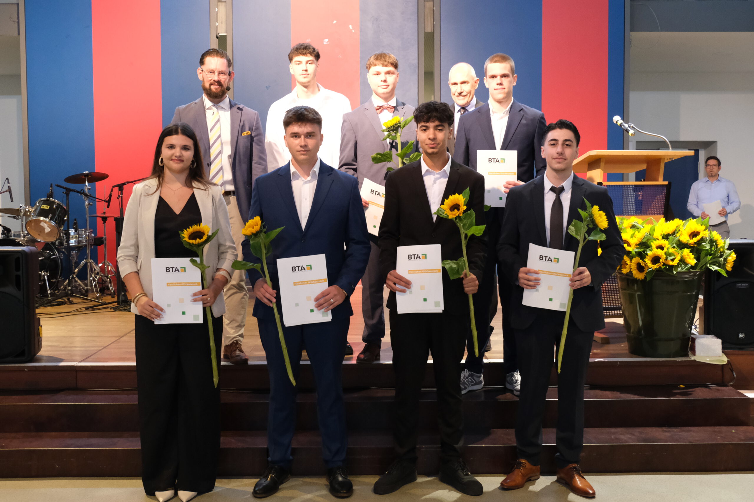 Der Vertreter des Fördervereins des BTA, Tobias Ross, überreichte in Anerkennung besonderer Leistungen Bildungsgutscheine im Wert von 125 Euro an die fünf besten Absolvent:innen des Jahrgangs: Paul Grotenhoff, Lotta Marie Schaten, Luca Terglane, Jonas Himmelberg, Alexander Wieser.