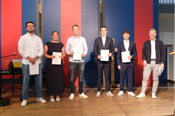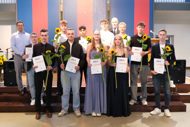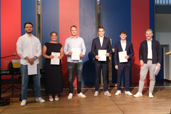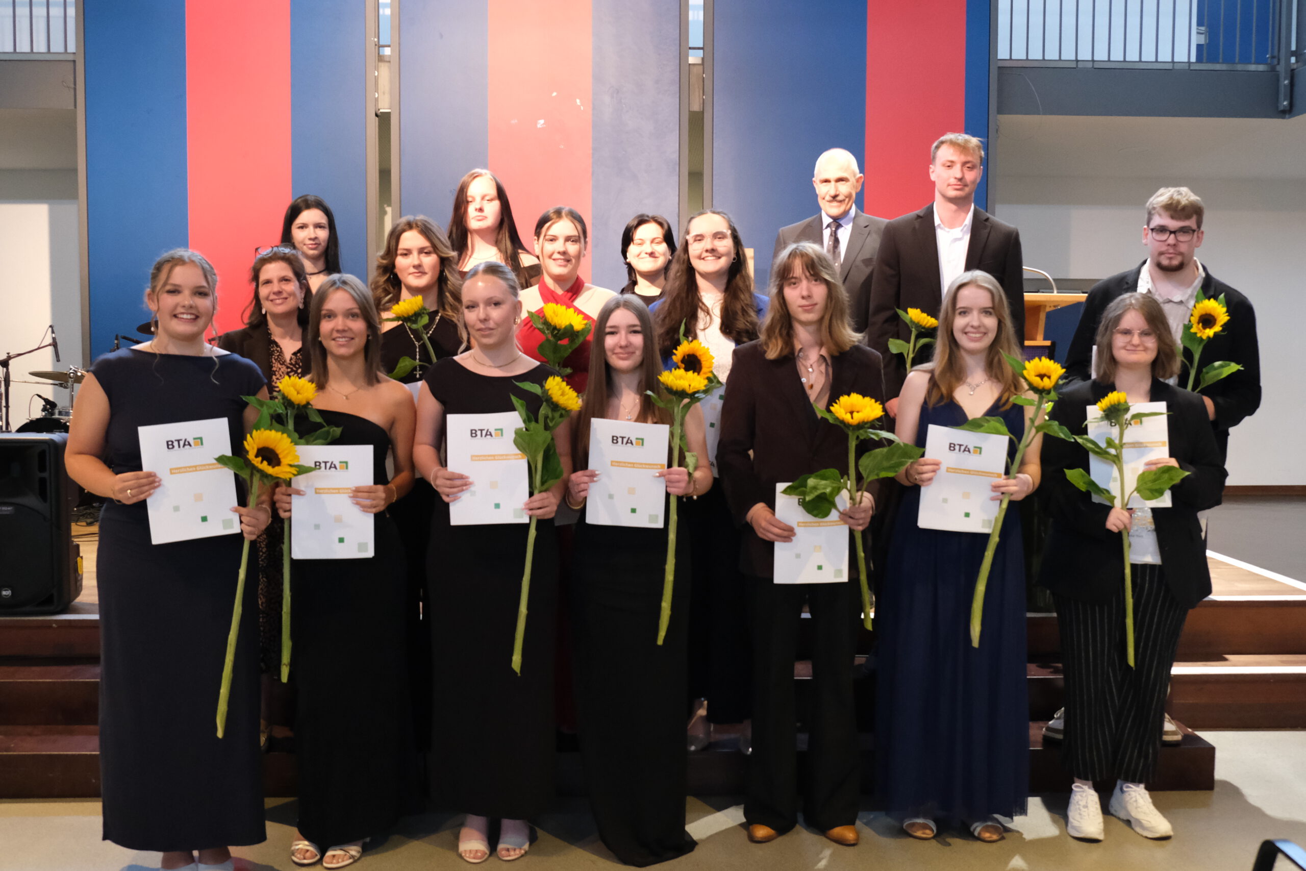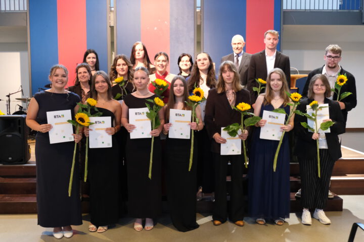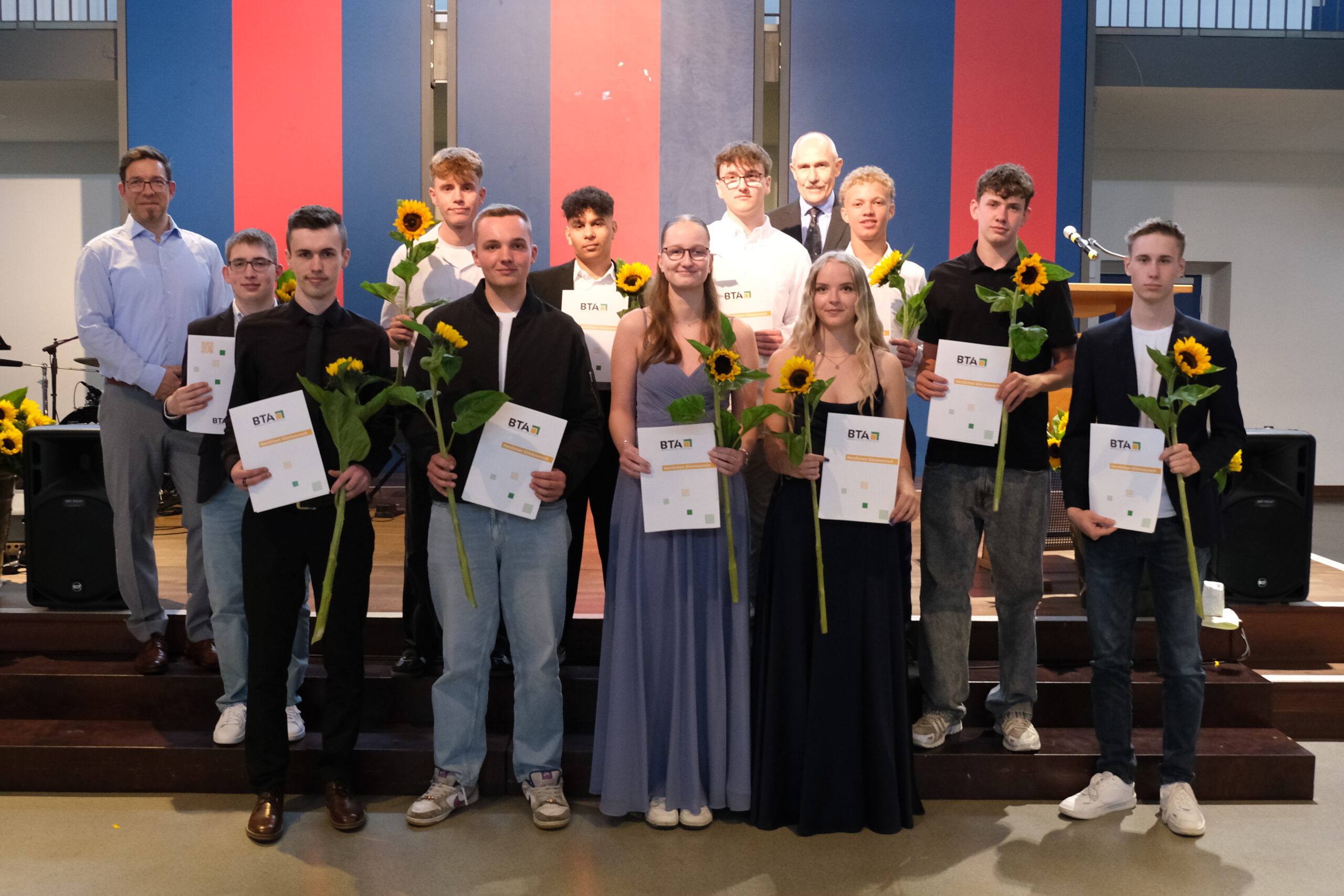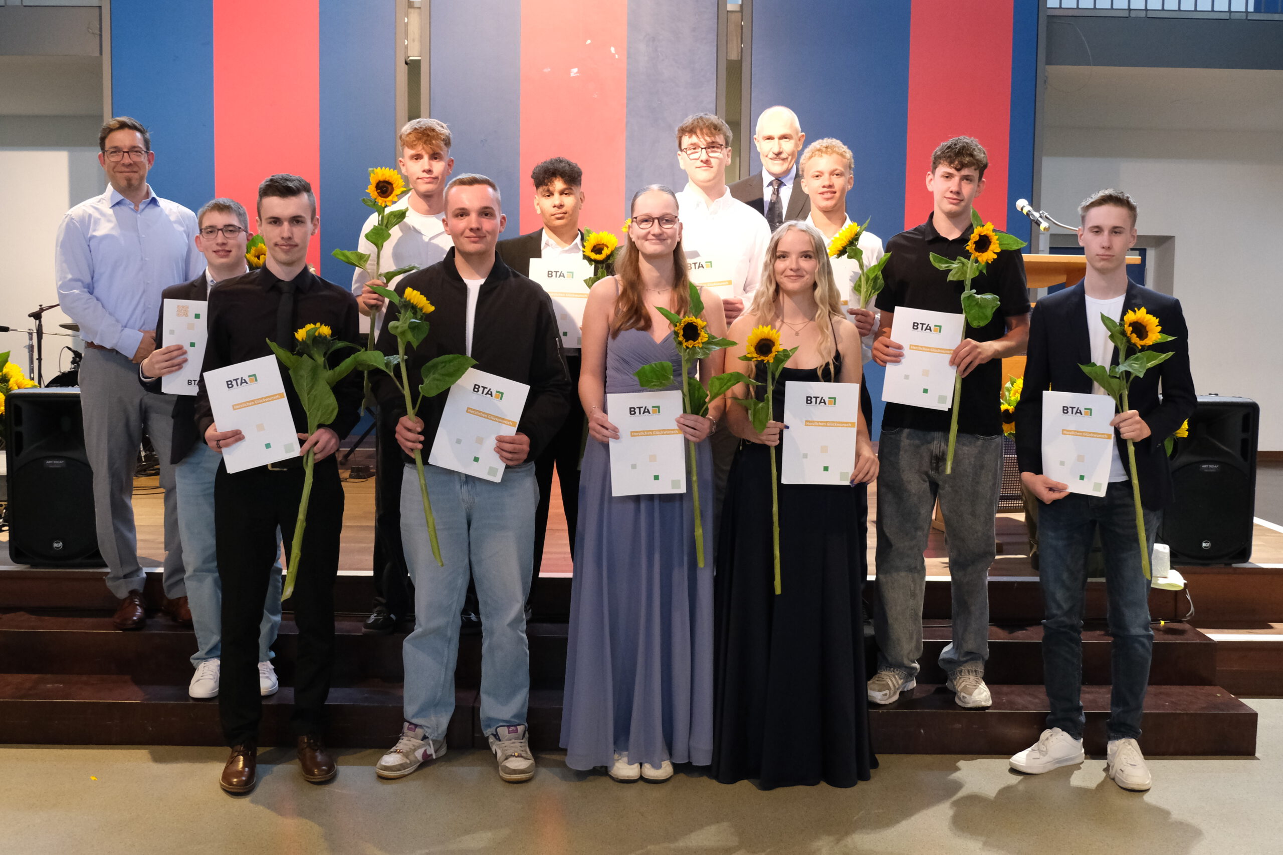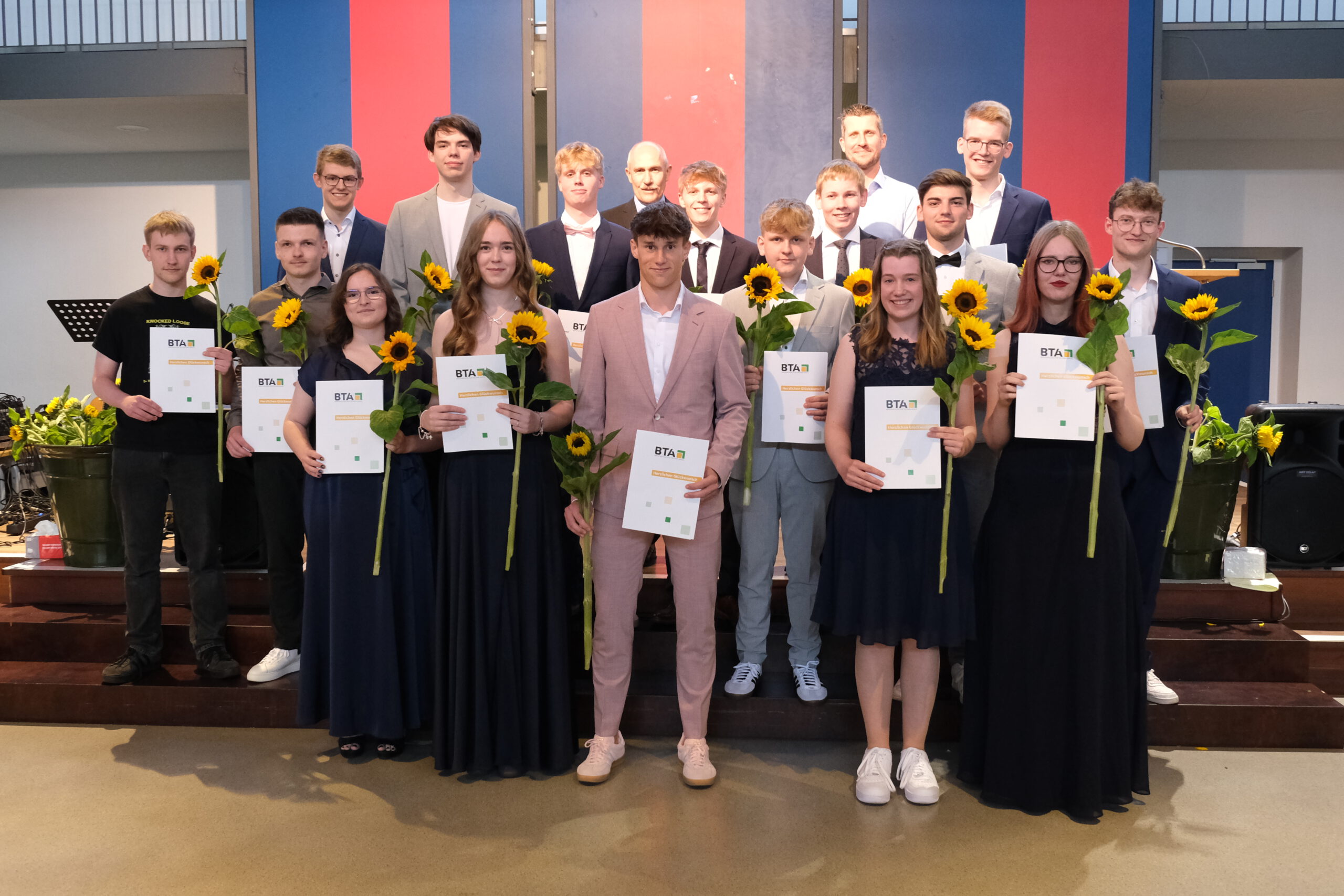 Der Vertreter des Fördervereins des BTA, Tobias Ross, überreichte in Anerkennung besonderer Leistungen Bildungsgutscheine im Wert von 125 Euro an die fünf besten Absolvent:innen des Jahrgangs: Paul Grotenhoff, Lotta Marie Schaten, Luca Terglane, Jonas Himmelberg, Alexander Wieser.