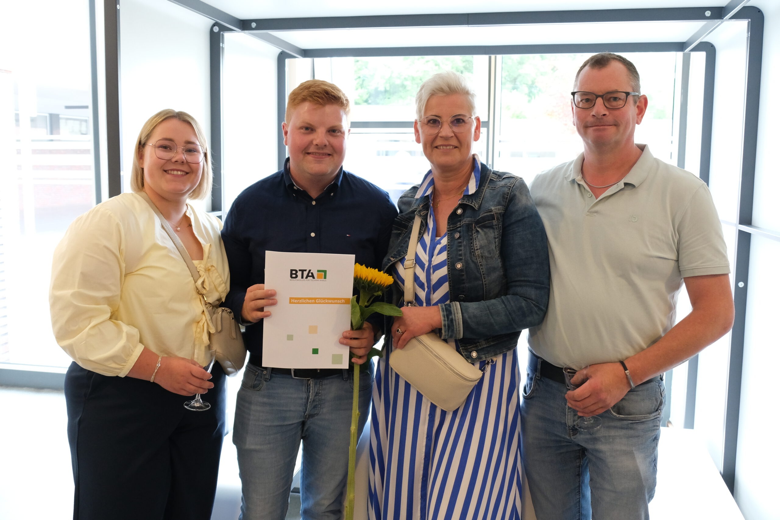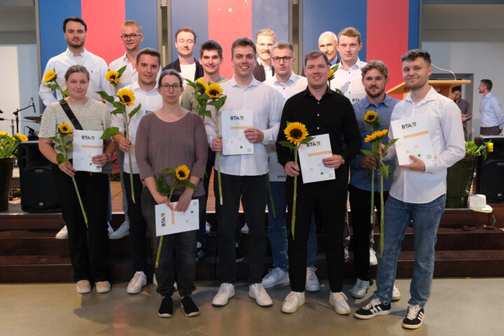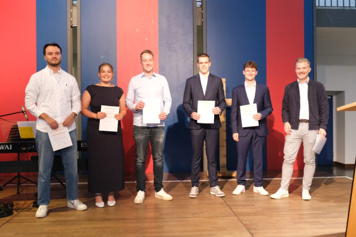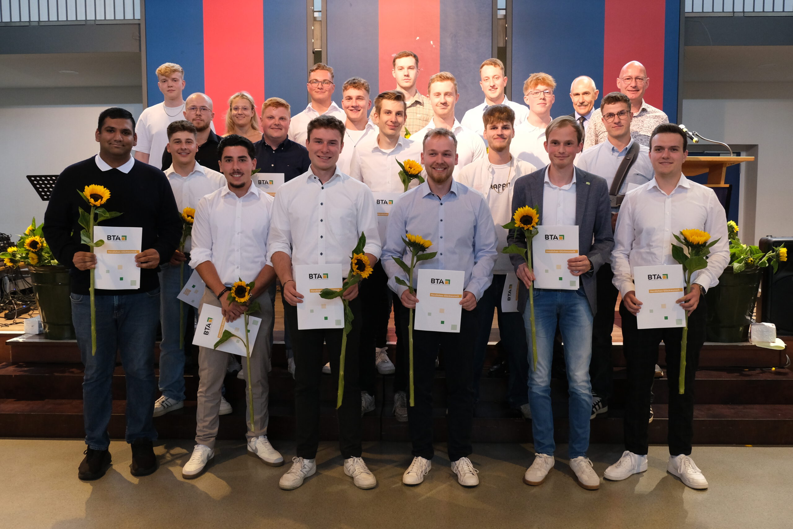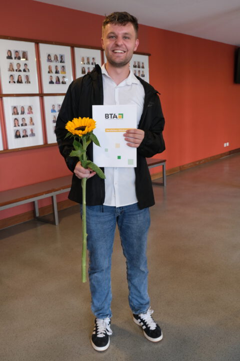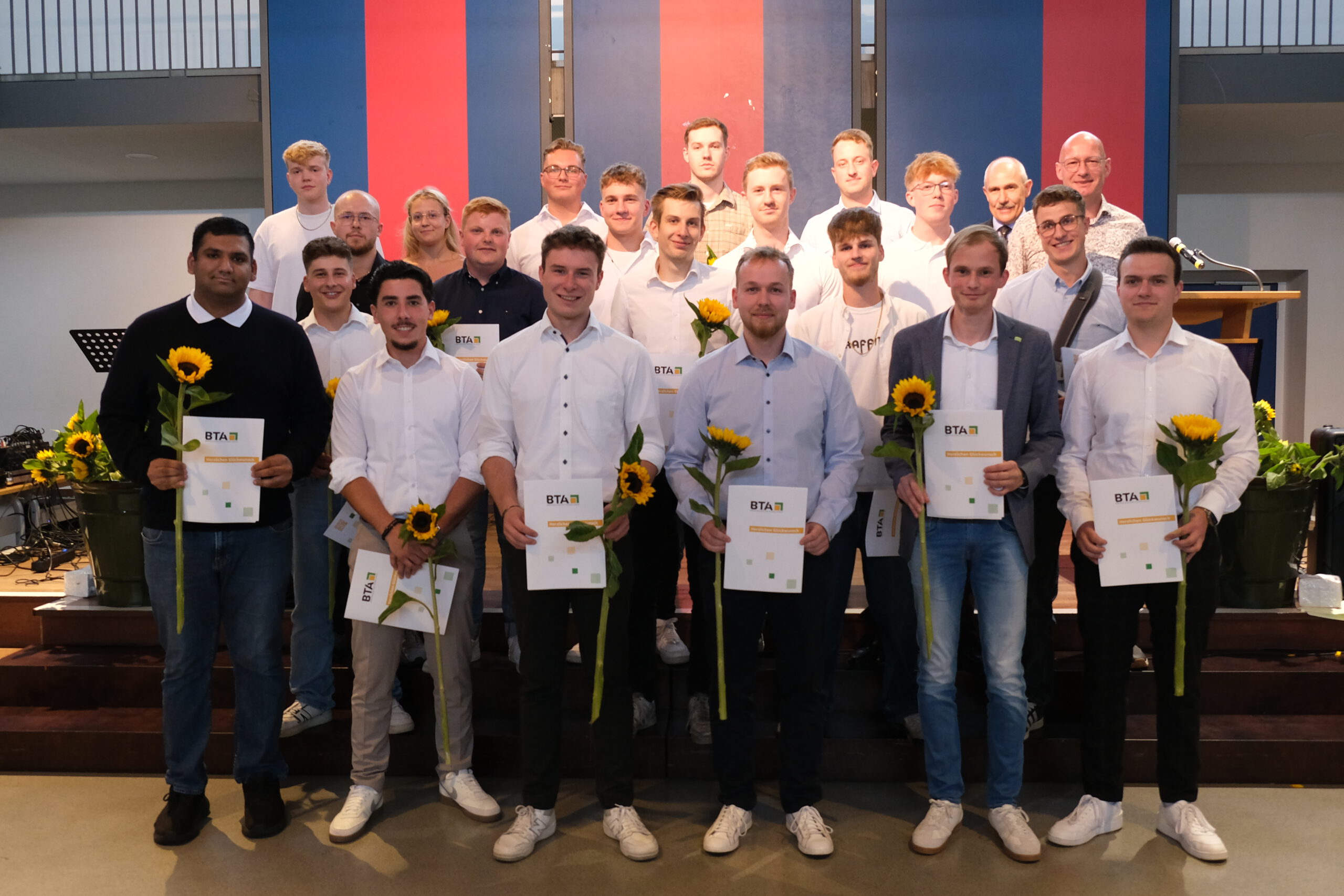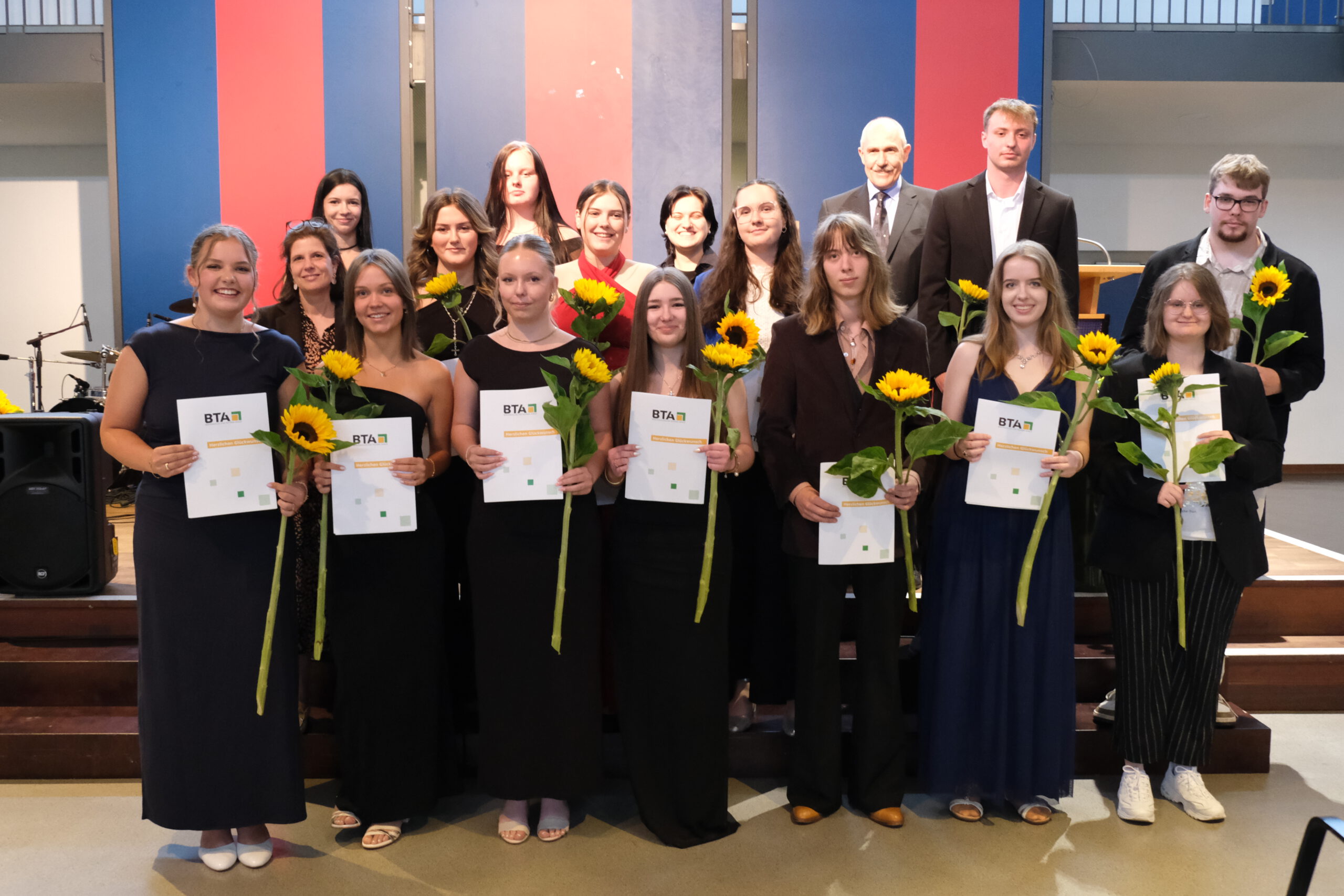 Der Vertreter des Fördervereins des BTA, Tobias Ross, überreichte in Anerkennung besonderer Leistungen Bildungsgutscheine im Wert von 125 Euro an die fünf besten Absolvent:innen des Jahrgangs: Paul Grotenhoff, Lotta Marie Schaten, Luca Terglane, Jonas Himmelberg, Alexander Wieser.