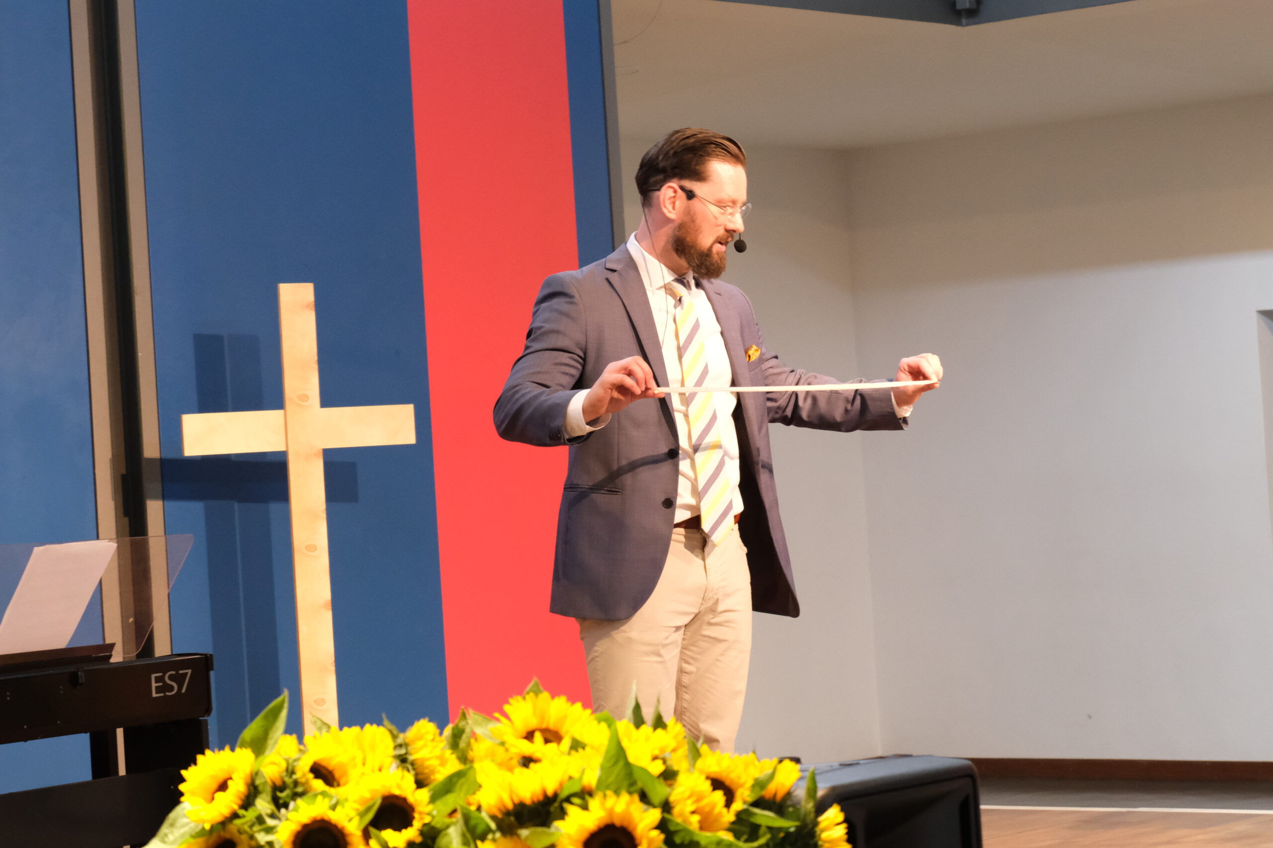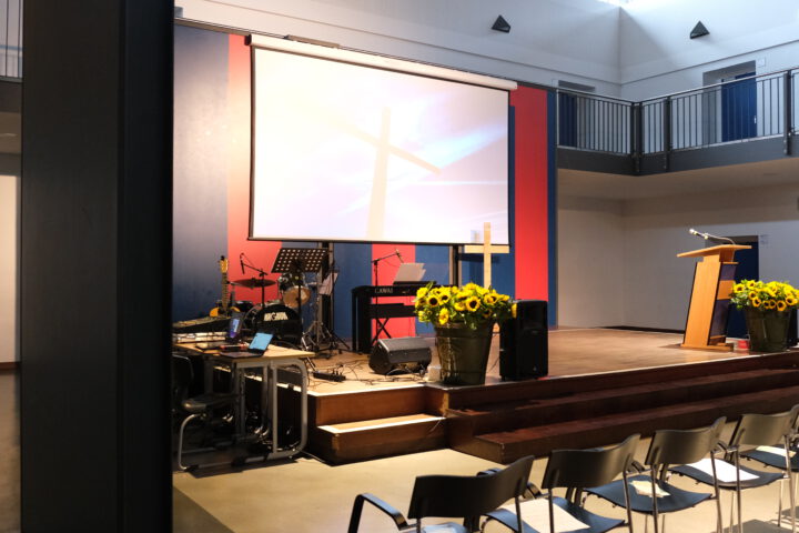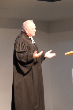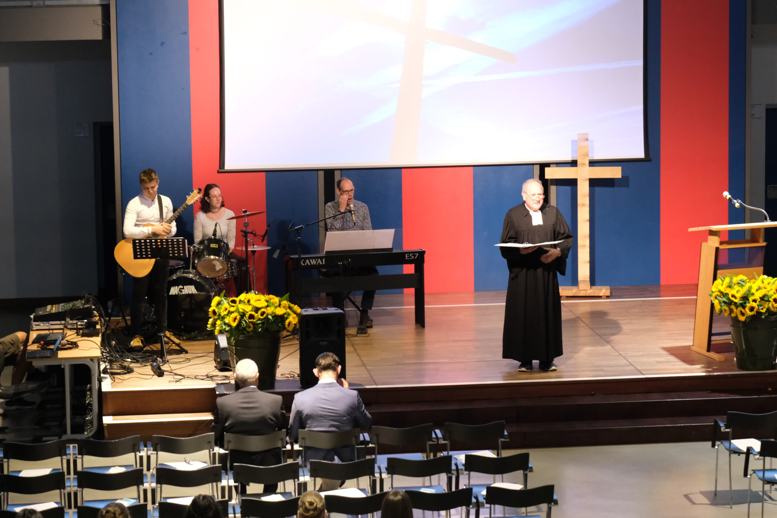 Pfarrer Klaus Fischer hielt den Gottesdienst, der musikalisch von einer Band unter der Leitung von Joas Hofsommer begleitet wurde (Keyboard, Gitarre, Schlagzeug, Technik: Joas Hofsommer, Anton Utkin, Luisa Hofsommer, Benno Schlünsen).