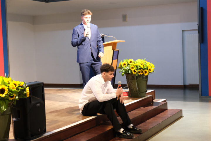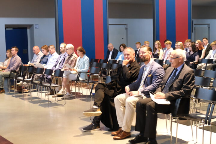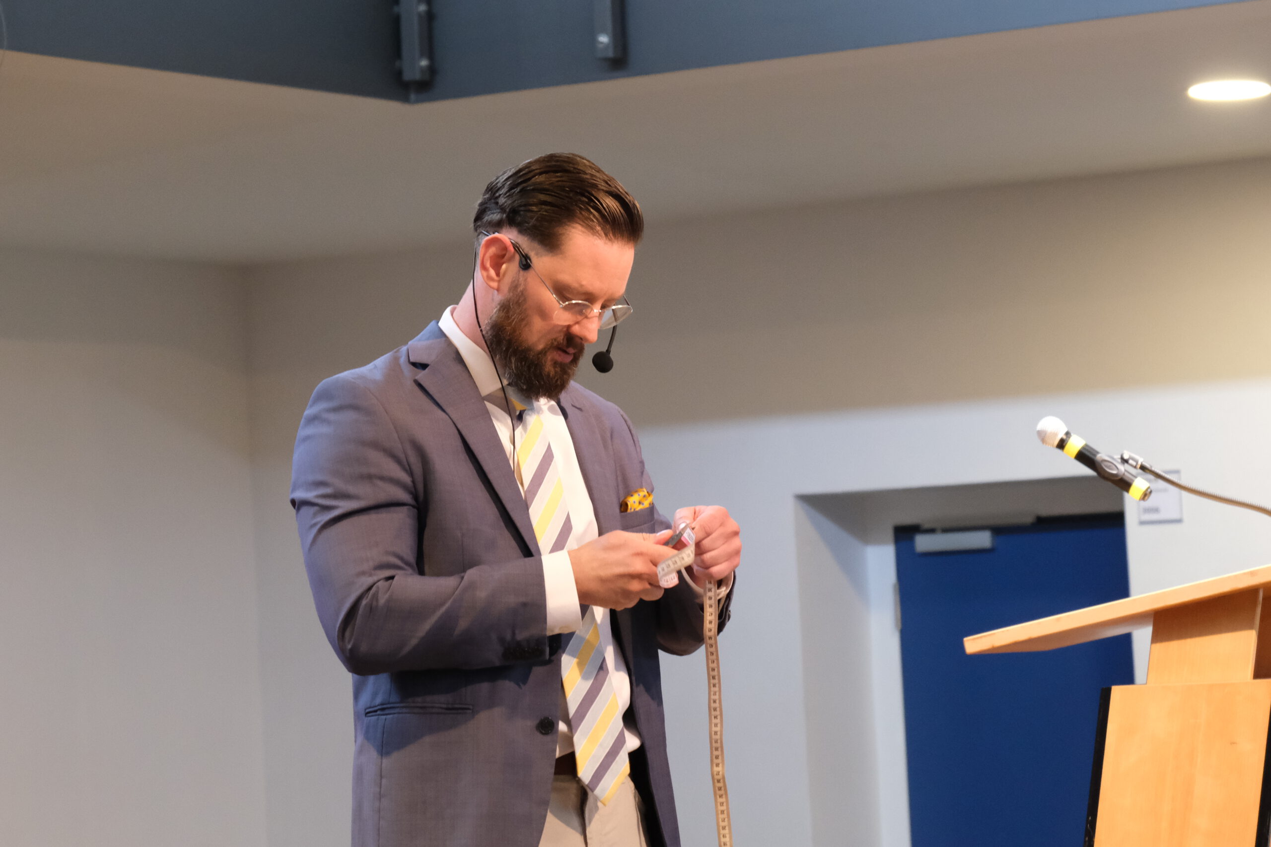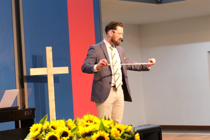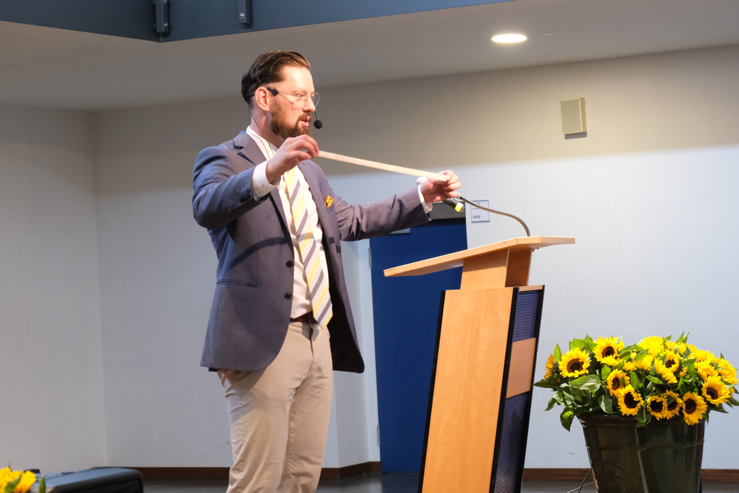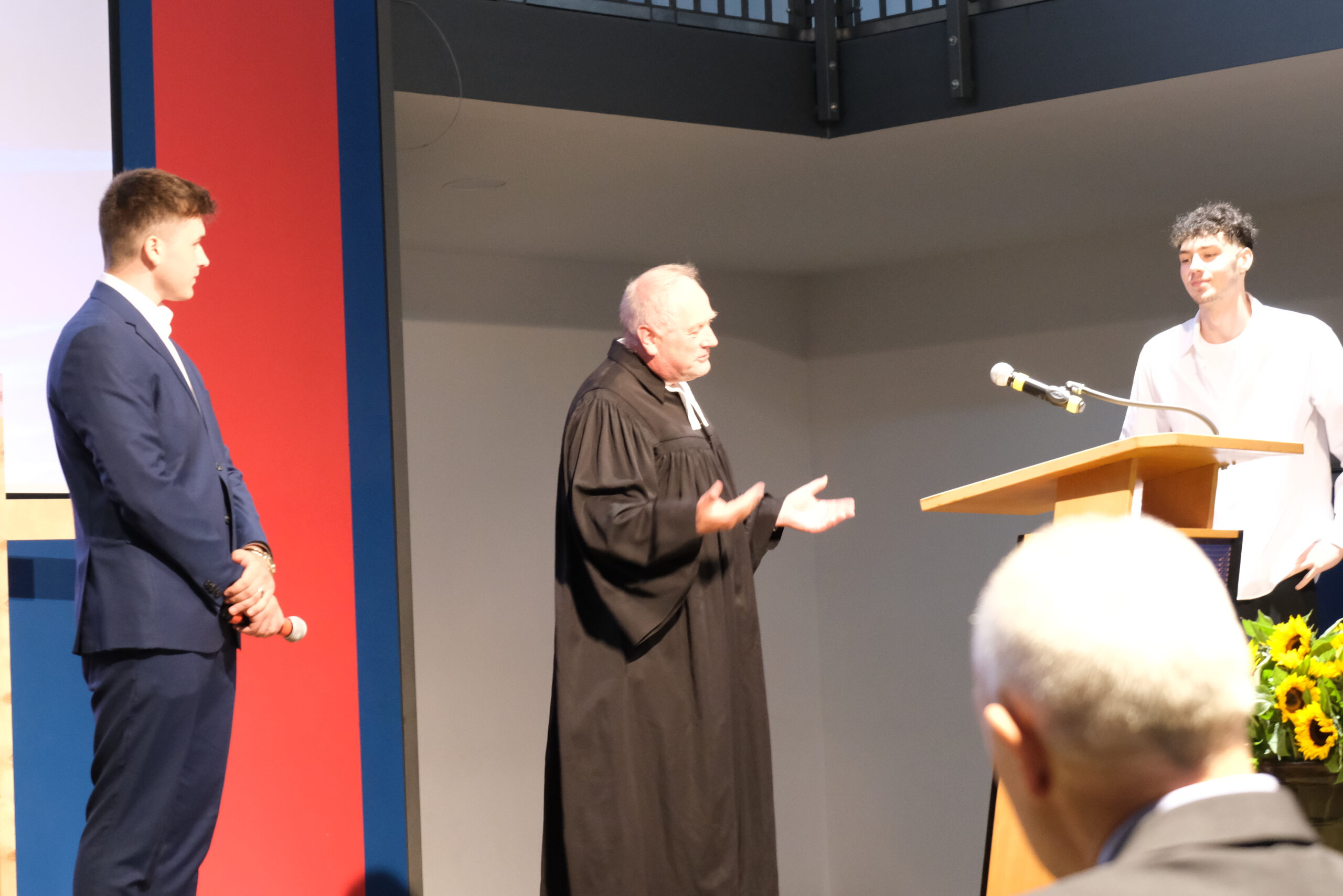 Gregor Burchardt gab den Absolvent:innen eine theologische Interpretation des Mottos „Wertvolle Zeiten“ mit auf den Weg, damit aus der Lebenszeit möglichst viel „wertvolle Zeit“ wird. Von der geschätzten durchschnittlichen Lebenszeit von ca. 80 Jahren, die er anhand eines Maßbandes mit 80 cm darstellte, schnitt er Stück für Stück Abschnitte ab, die für das Schlafen, die Körperpflege, Arbeit, Medienkonsum und andere Dinge standen. Er rief die Absolvent:innen dazu auf, die noch übrig gebliebene (recht wenige) Zeit für möglichst wertvolle Dinge zu nutzen. Auch die Gäste wurden gefragt, welche Zeiten für sie wertvoll erscheinen. Da wurde die Zeit mit Familien und Freunden an erster Stelle genannt.