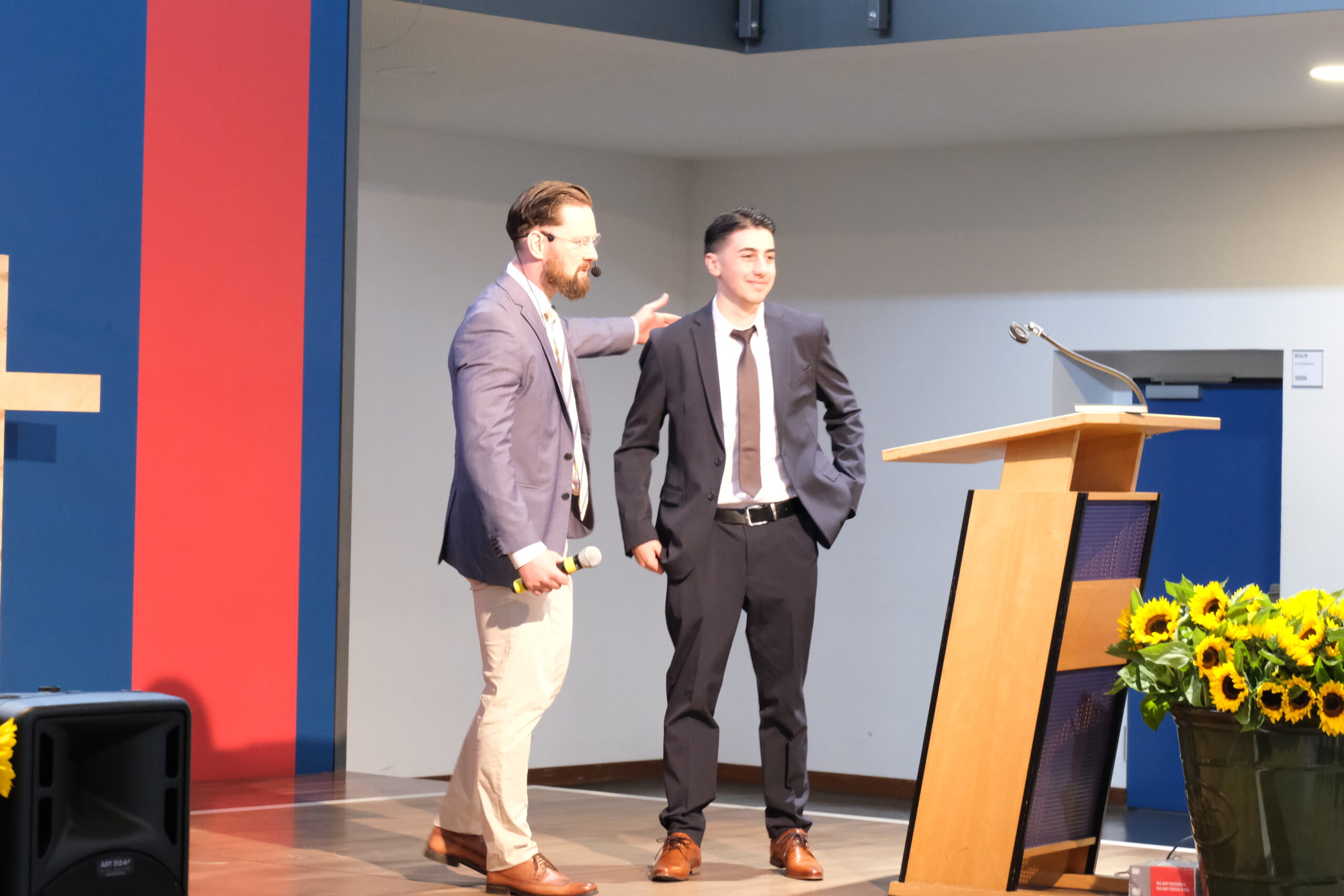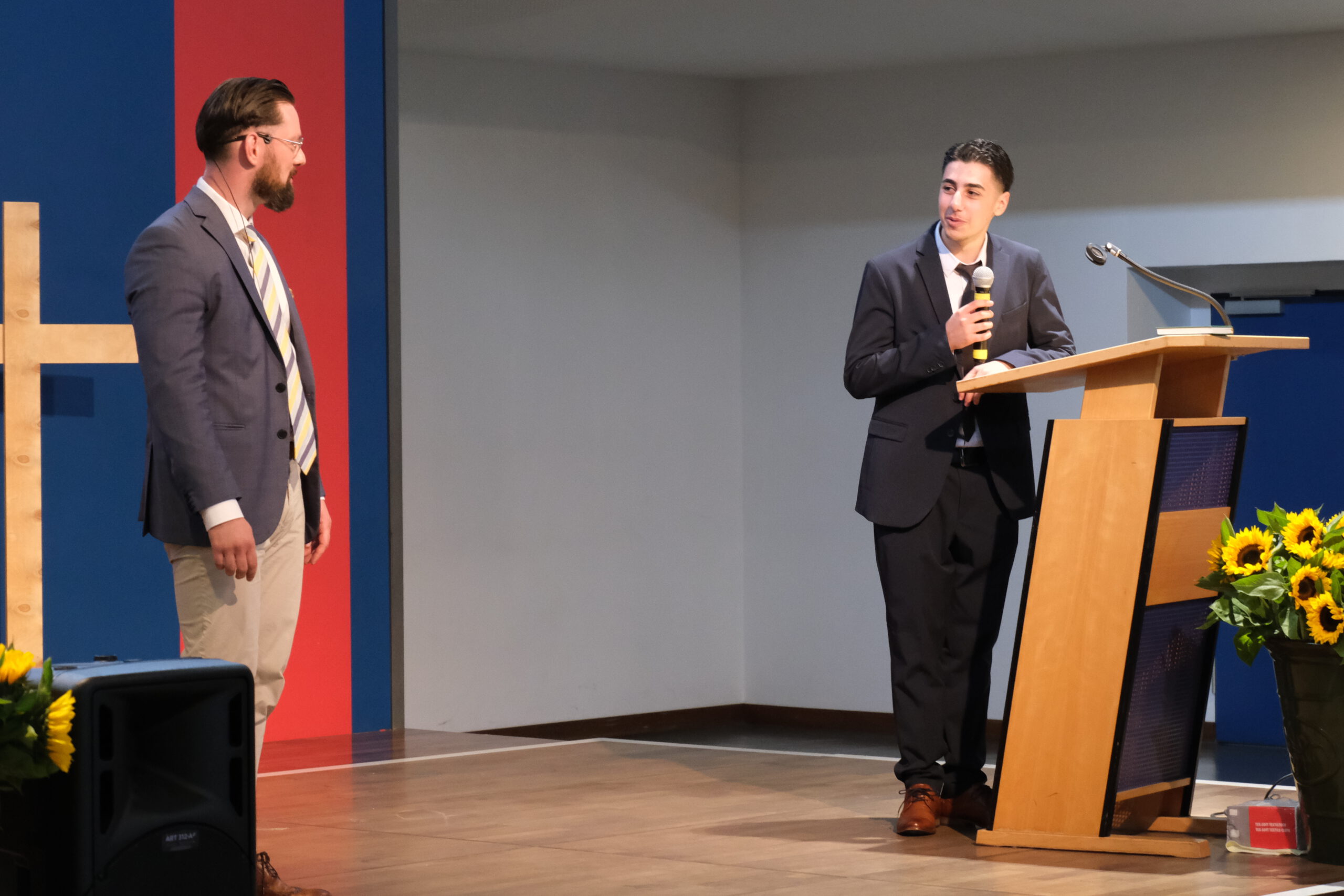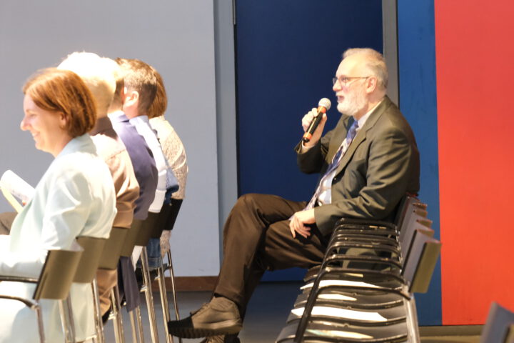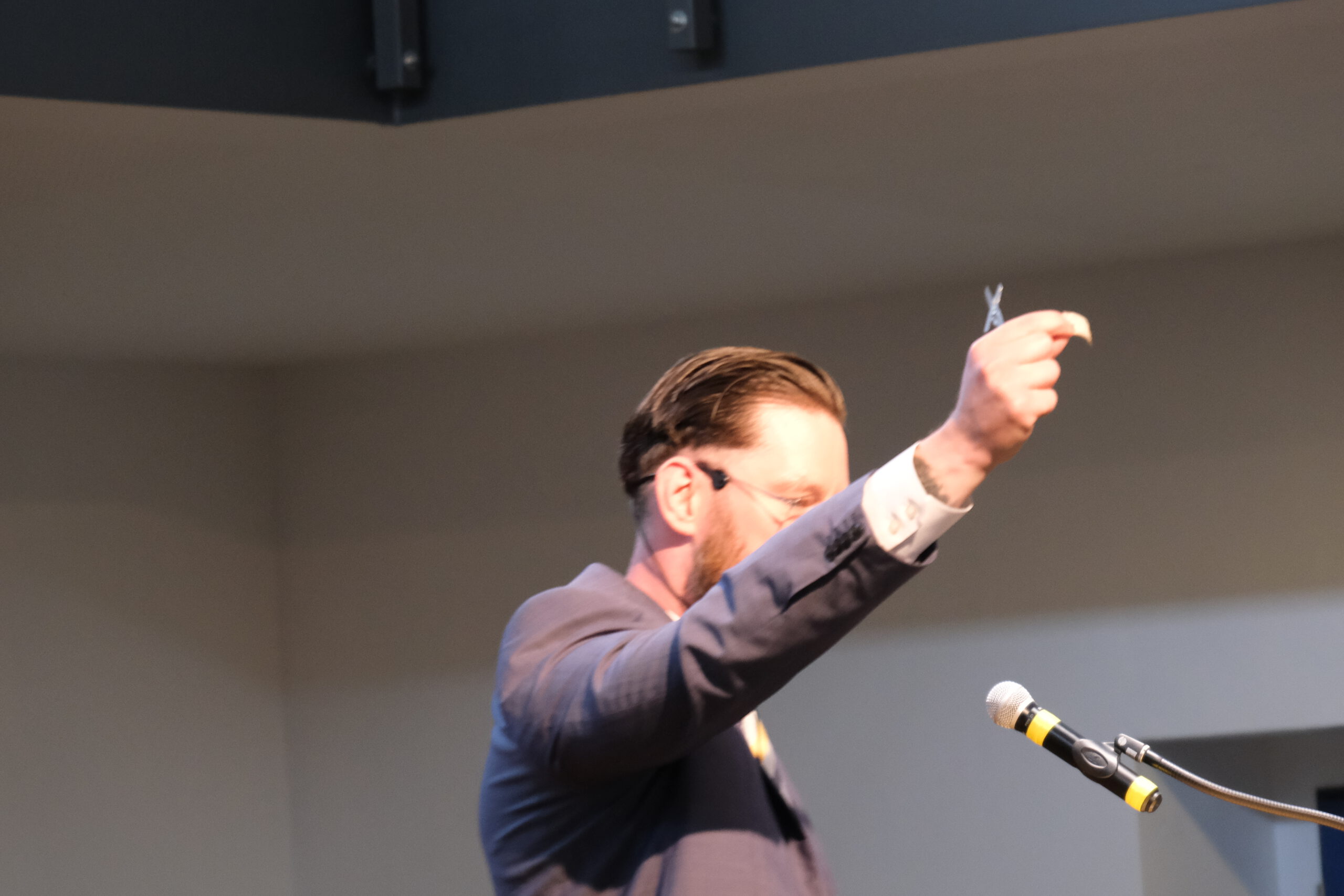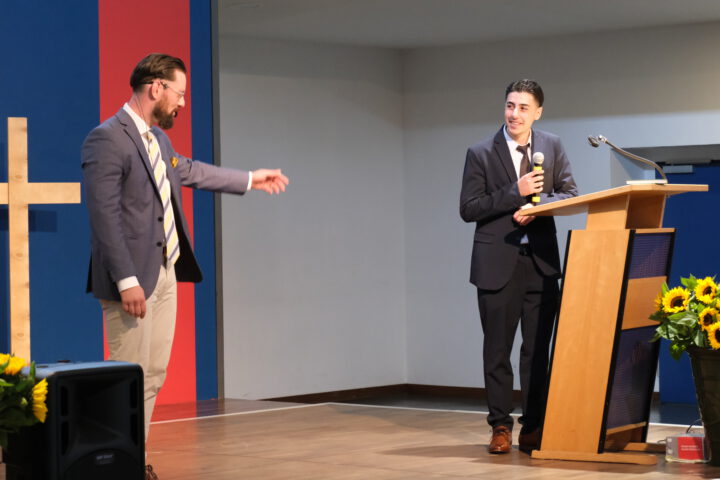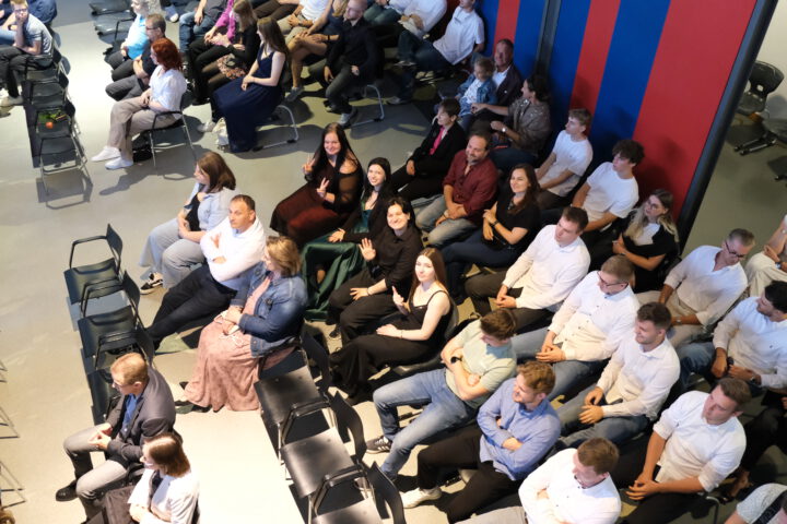 Gregor Burchardt gab den Absolvent:innen eine theologische Interpretation des Mottos „Wertvolle Zeiten“ mit auf den Weg, damit aus der Lebenszeit möglichst viel „wertvolle Zeit“ wird. Von der geschätzten durchschnittlichen Lebenszeit von ca. 80 Jahren, die er anhand eines Maßbandes mit 80 cm darstellte, schnitt er Stück für Stück Abschnitte ab, die für das Schlafen, die Körperpflege, Arbeit, Medienkonsum und andere Dinge standen. Er rief die Absolvent:innen dazu auf, die noch übrig gebliebene (recht wenige) Zeit für möglichst wertvolle Dinge zu nutzen. Auch die Gäste wurden gefragt, welche Zeiten für sie wertvoll erscheinen. Da wurde die Zeit mit Familien und Freunden an erster Stelle genannt.