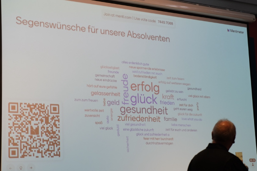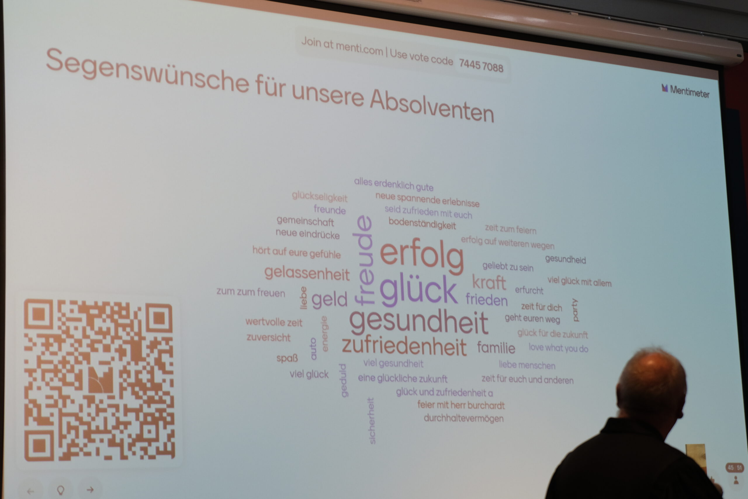 Später konnten die Eltern der Absolvent:innen ihren Kindern mit Hilfe des Programms Mentimeter gute Wünsche aufschreiben, die in einer Wortwolke gesammelt wurden. „Glück, Gesundheit und Erfolg“ standen dabei an erster Stelle.