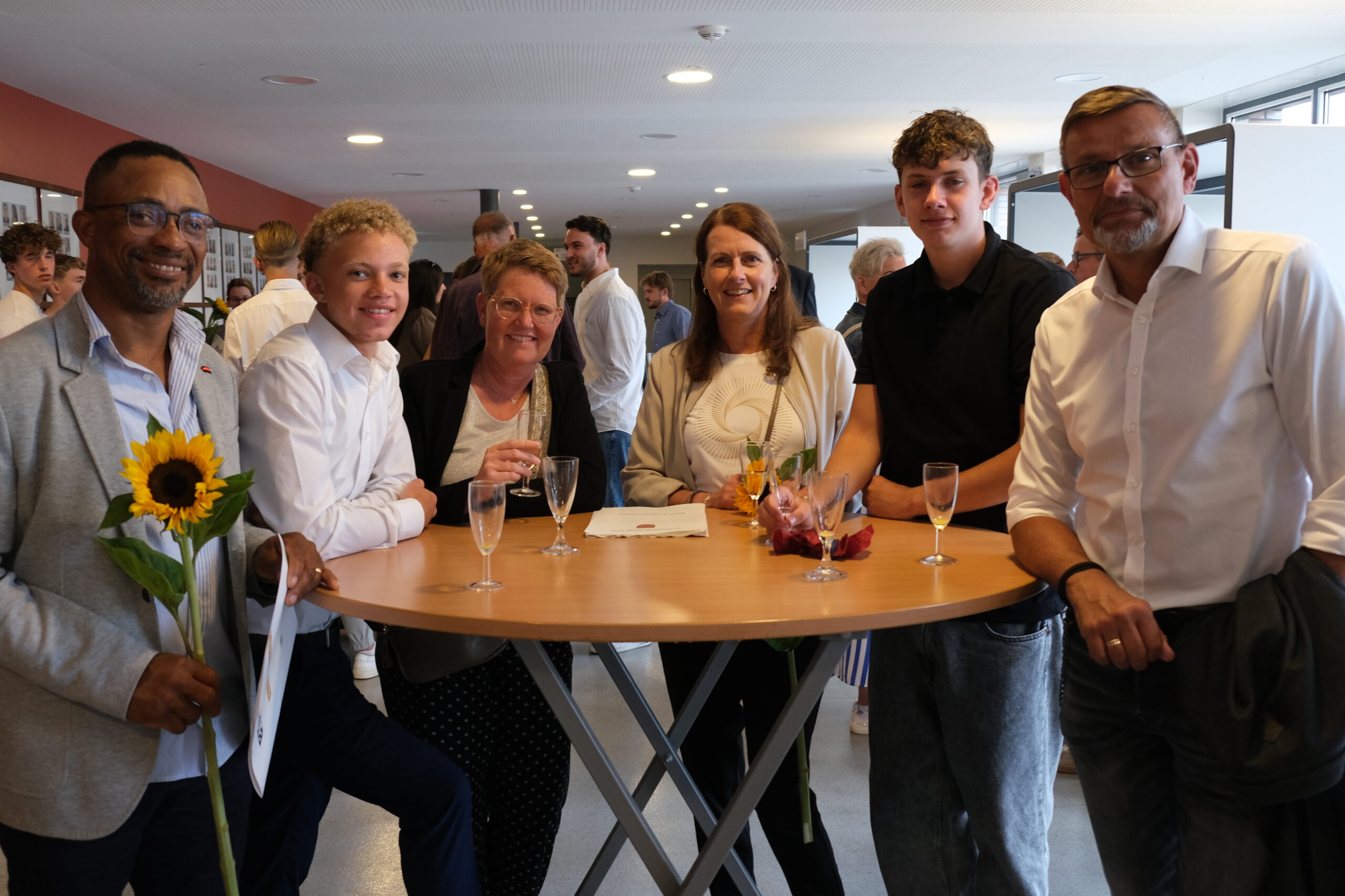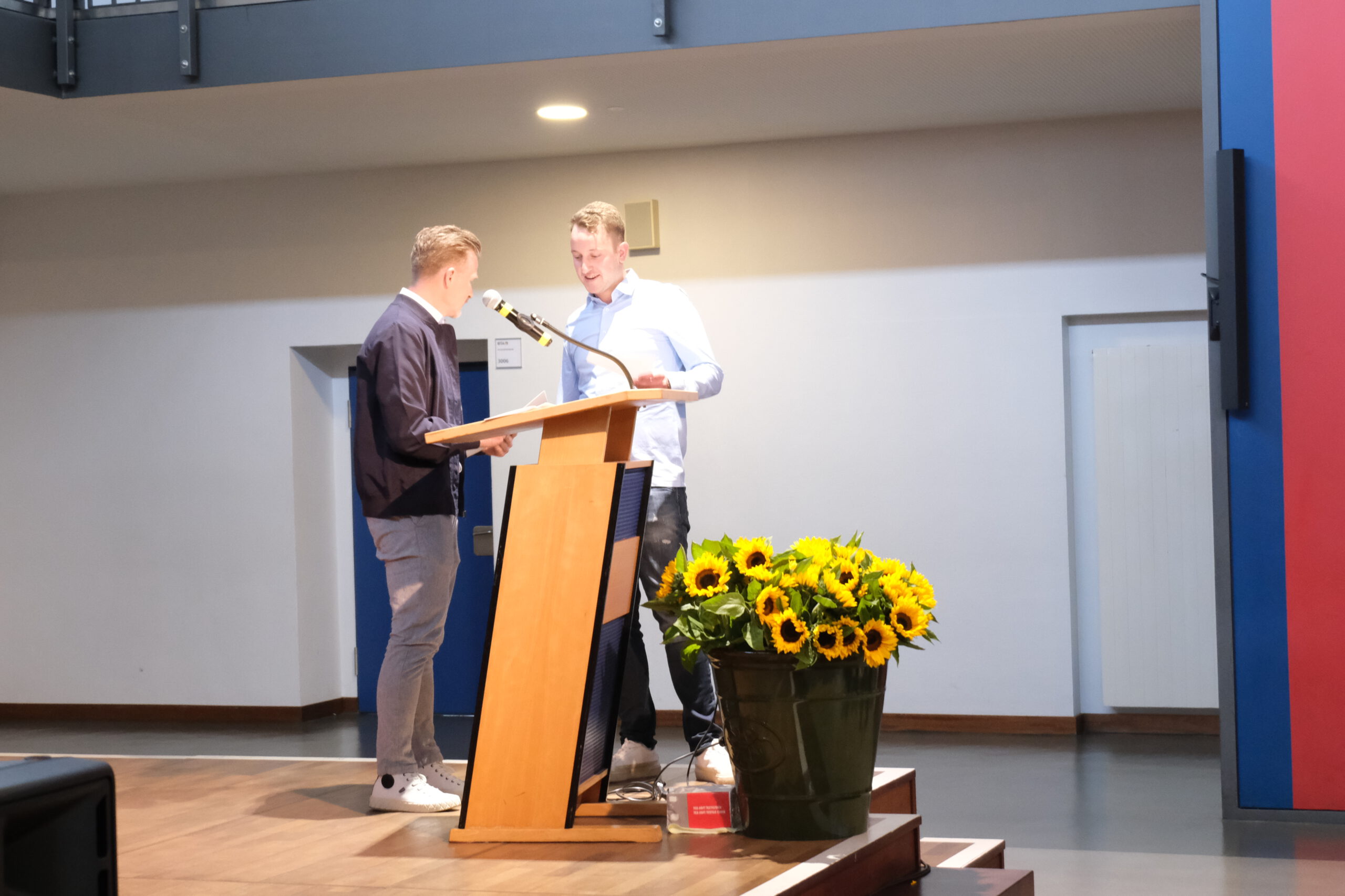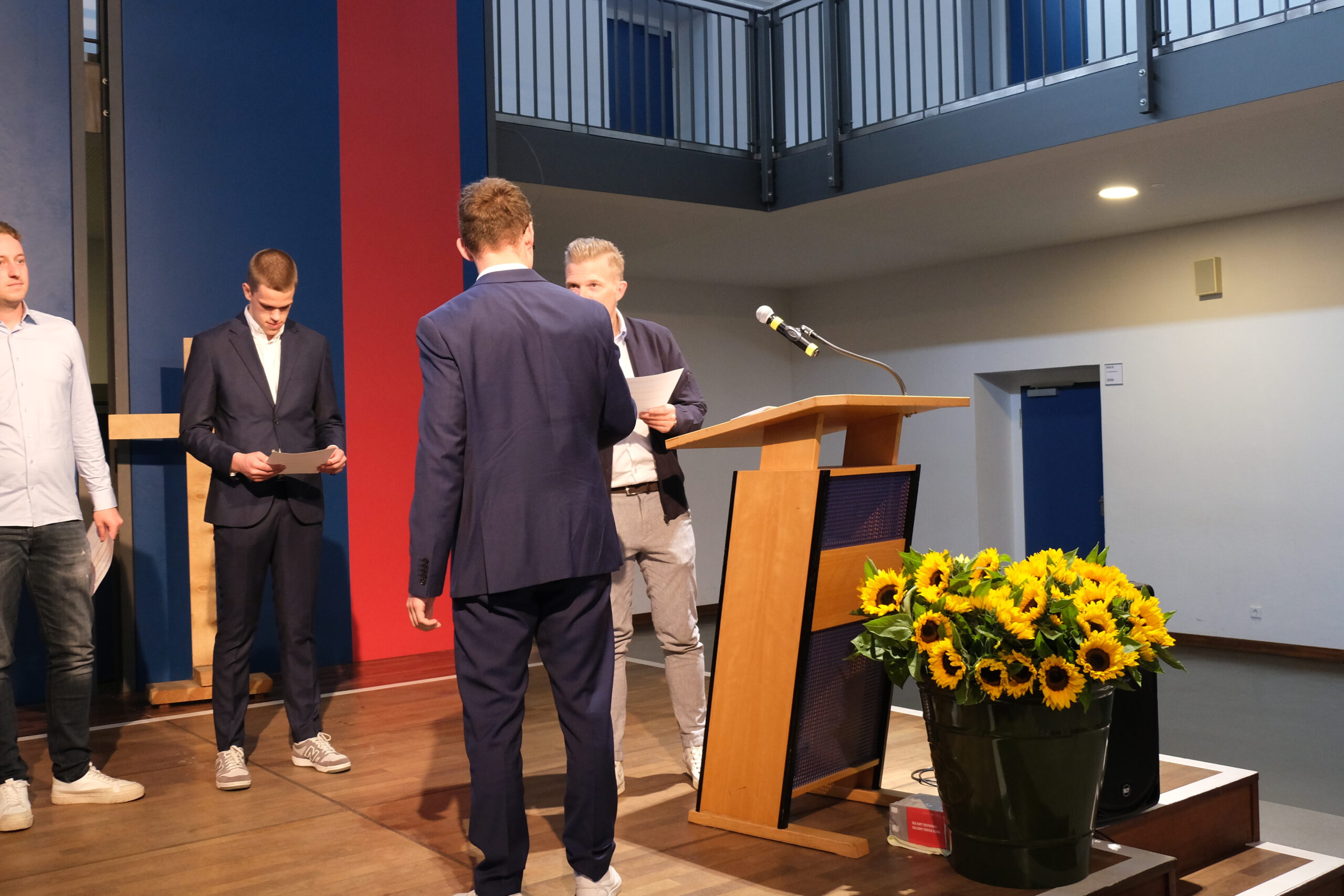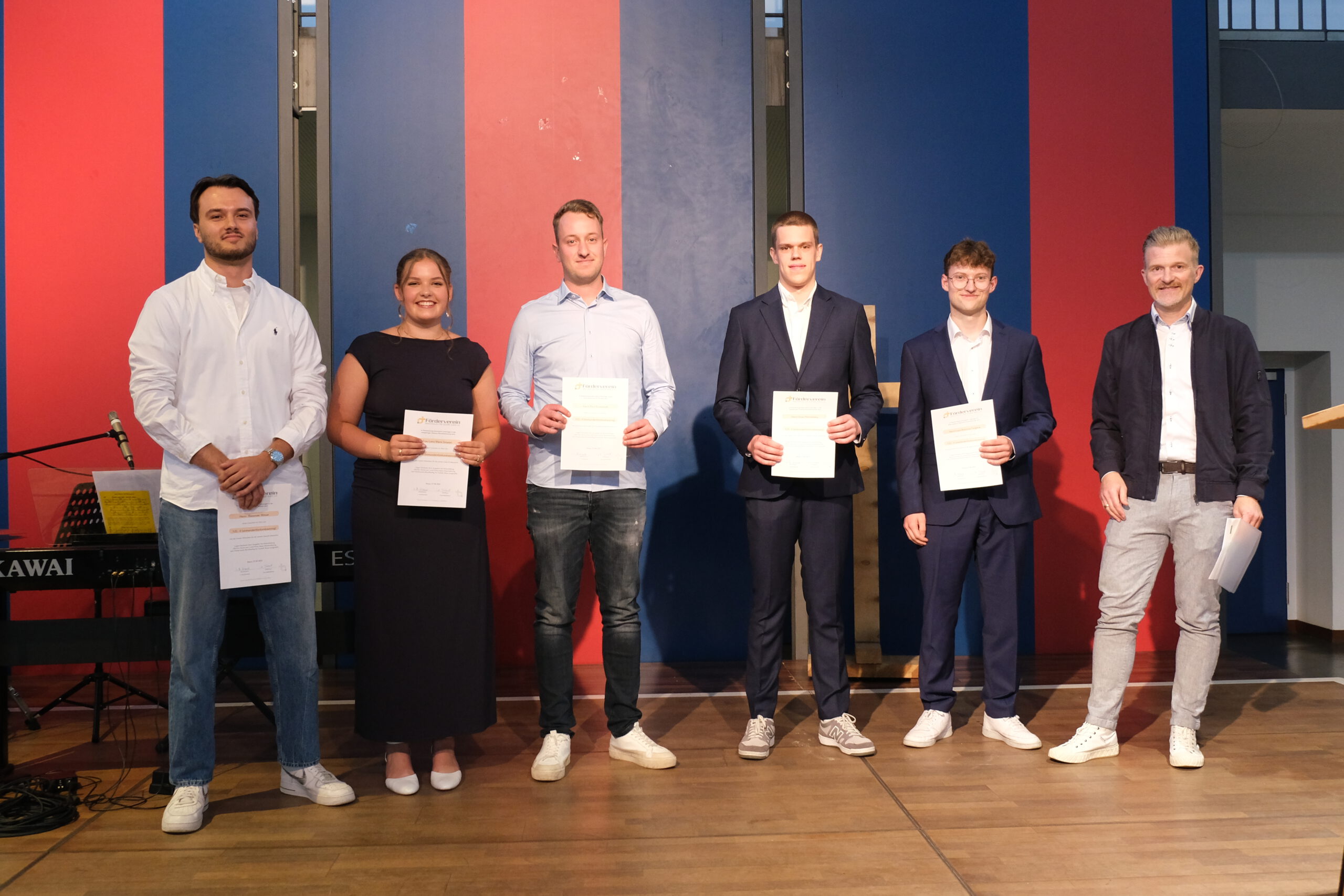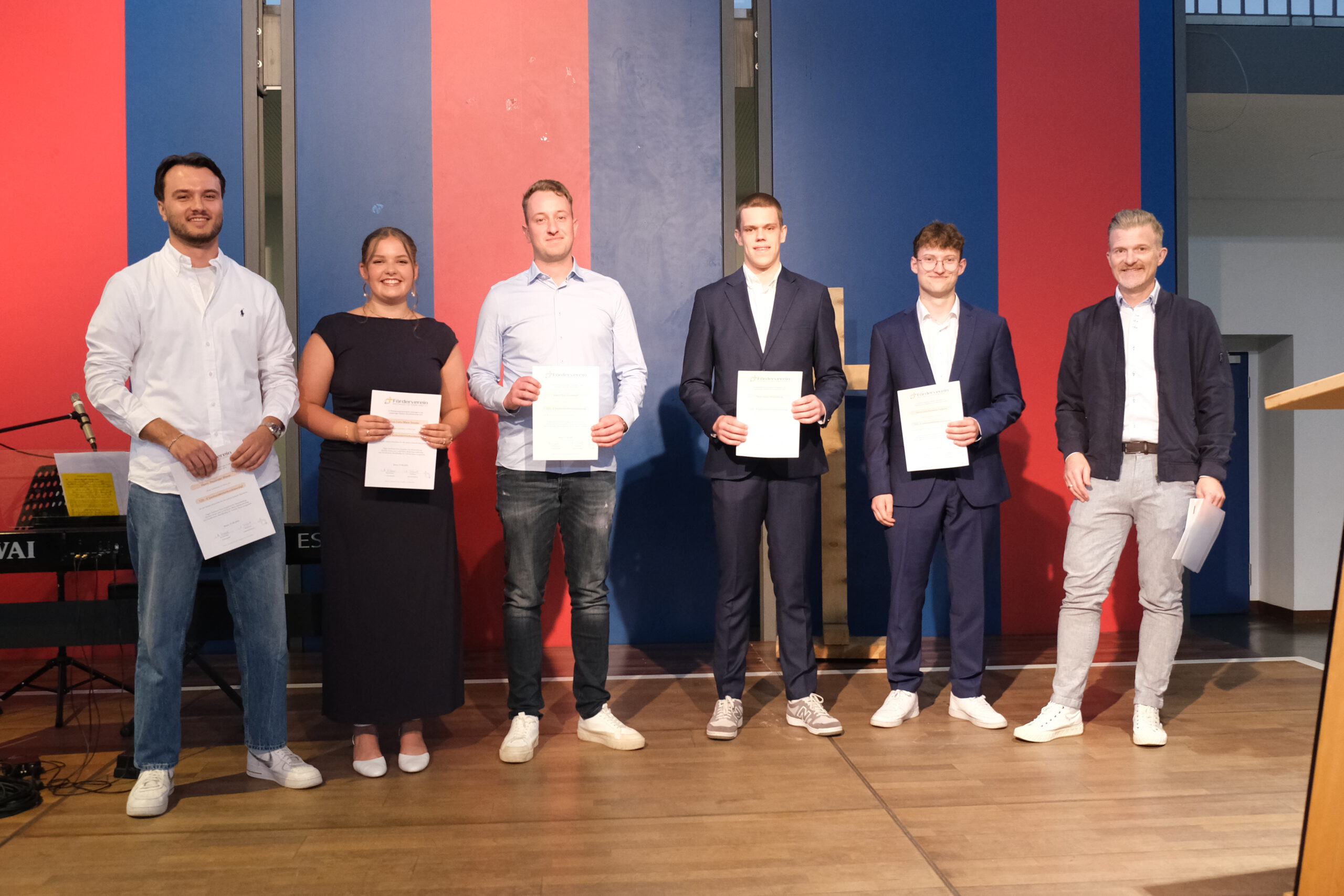 Der Vertreter des Fördervereins, Tobias Ross (rechts), überreichte die Bildungsgutscheine an die fünf Besten der Absolvent:innen.