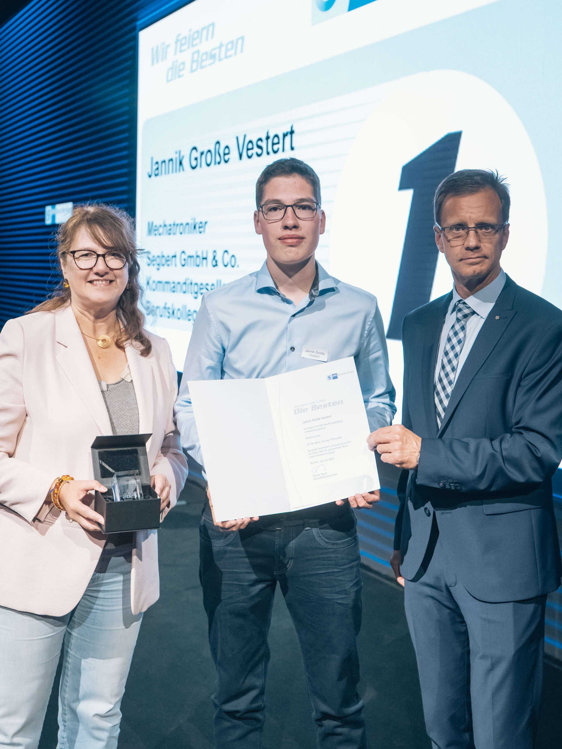 Die Feierlichkeiten wurden von rund 250 Gästen begleitet, die gekommen waren, um die jungen Talente zu feiern. Carsten Sühling, IHK-Vizepräsident und Vorsitzender des IHK-Regionalausschusses für den Kreis Borken, hob die sehr guten Zukunftsaussichten für alle anderen erfolgreichen Absolventinnen und Absolventen hervor: „Sehr oft sehen wir in den Unternehmen junge Führungskräfte, die sich aus den Reihen der eigenen Auszubildenden rekrutieren“, betonte der Geschäftsführer von Spaleck aus Bocholt. Der Grund dafür liegt für ihn auf der Hand: „Diese jungen Menschen verfügen häufig über die notwendige Fachkenntnis, die soziale Kompetenz und den Respekt der Kolleginnen und Kollegen.“